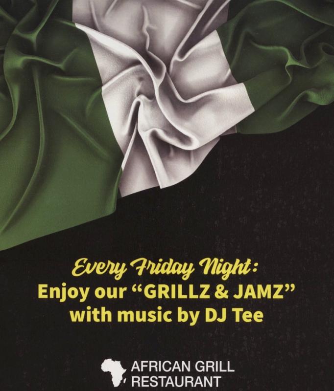 ID: The front page of the menu is a shade of dark green and has "African Grill Restaurant" printed in a large, white font at the top. The menu is still split into 5 sections: African Starters, Main Dishes, African Soups*, From The Grill, and Sides. Each consists of two to seven items of food per category, with the price of the item listed next to it. The back of the menu contains a Nigerian flag, while right below it states, "Every Friday Night: Enjoy our 'GRILLZ & JAMZ' with music by DJ Tee"