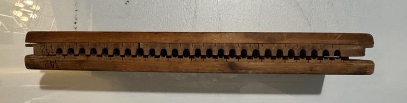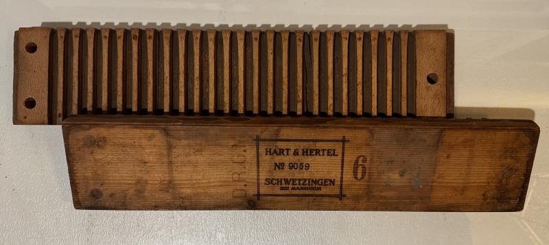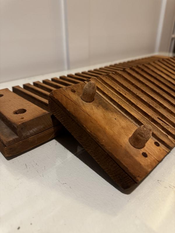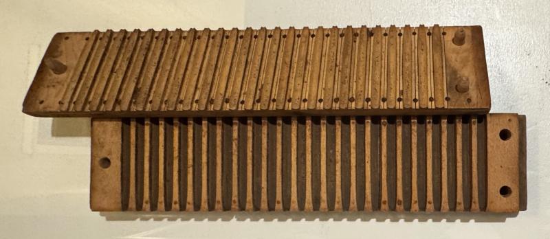 Vintage cigar press made of softwood on the outside and copper beech on the lower layer with hornbeam in the area of the sharp edges on the upper layer. This particular press was No. 9059. The wood is stamped with a “6” and the letters “D.R.G.I.” and has the numbers “342” stamped on the side twice. The cigar press represents the skilled, hands-on labor of cigar makers who relied on craftsmanship for their livelihood. It symbolizes pride in manual work
