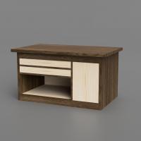 This is an image of a console table that was computer rendered. Every part in the model was designed with building the model in mind. As rendered, it has a dark wood top and sides with two drawers with a light front. It also has a side door with for…